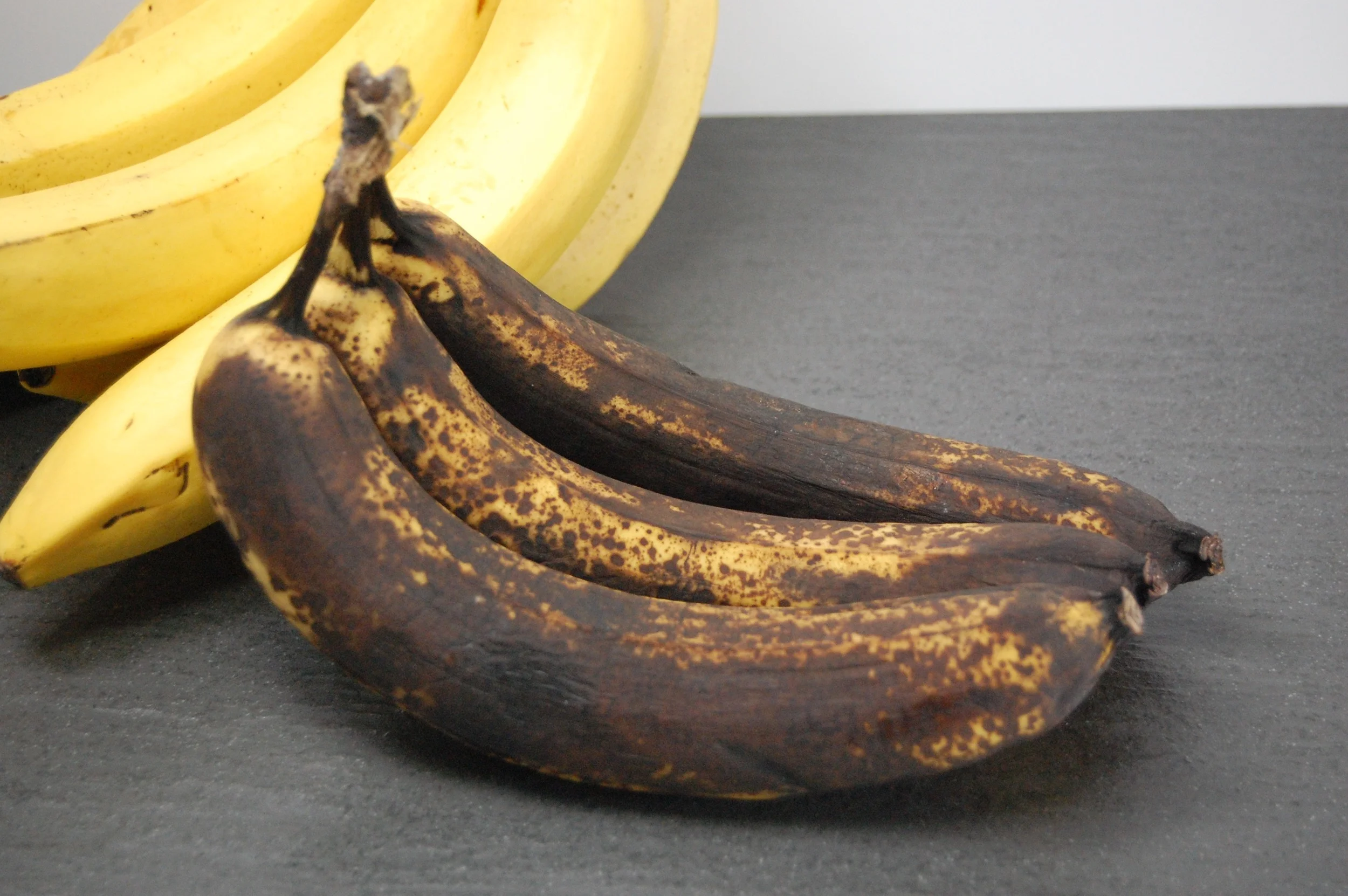 We always have a lot of bananas around at our house, at all stages of ripeness. I like to eat mine when they're still completely yellow with a little bit of green near the stem. Zoey likes hers when they just start forming brown spots. And we always like to have really ripe ones around for smoothies and banana nice cream. But some always get to a certain point—that dark, mushy stage when they'll fall right off the stem when you pick them up—the point right when they're about to go from being overripe to rotten.