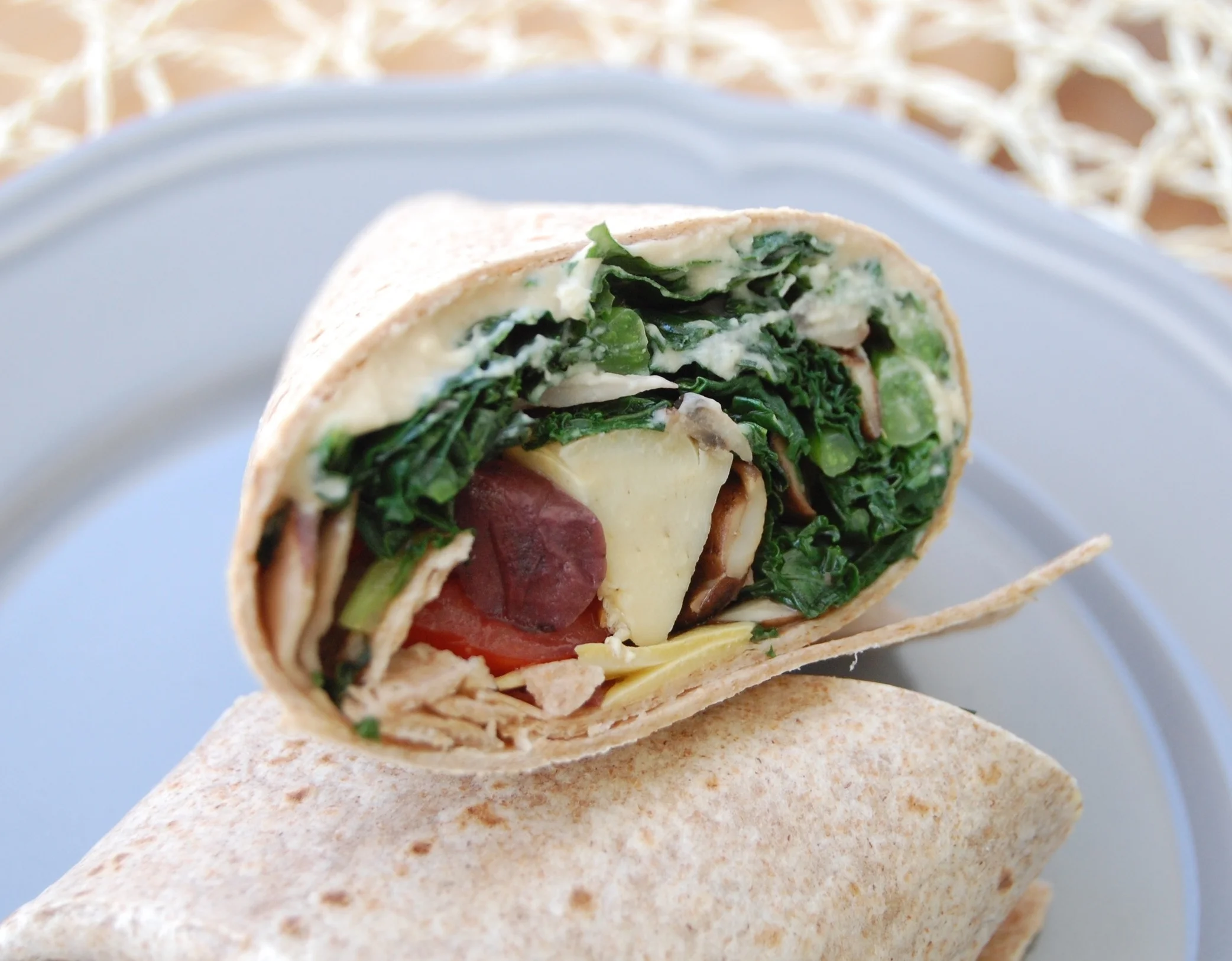 - Lay wraps onto a flat surface. Spread 1 tablespoon of hummus over each wrap. Top each wrap with half of the sautéed kale and mushrooms.