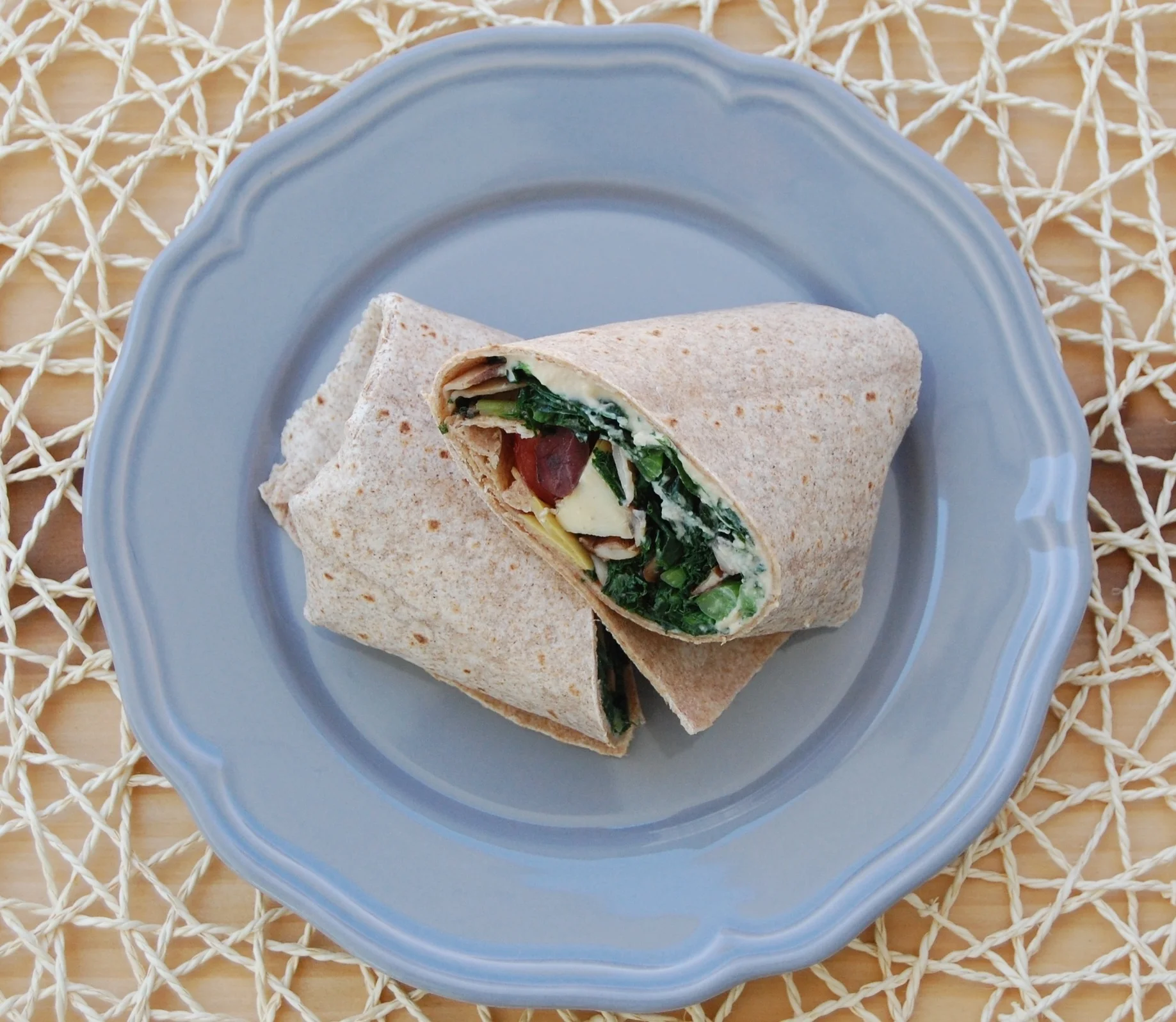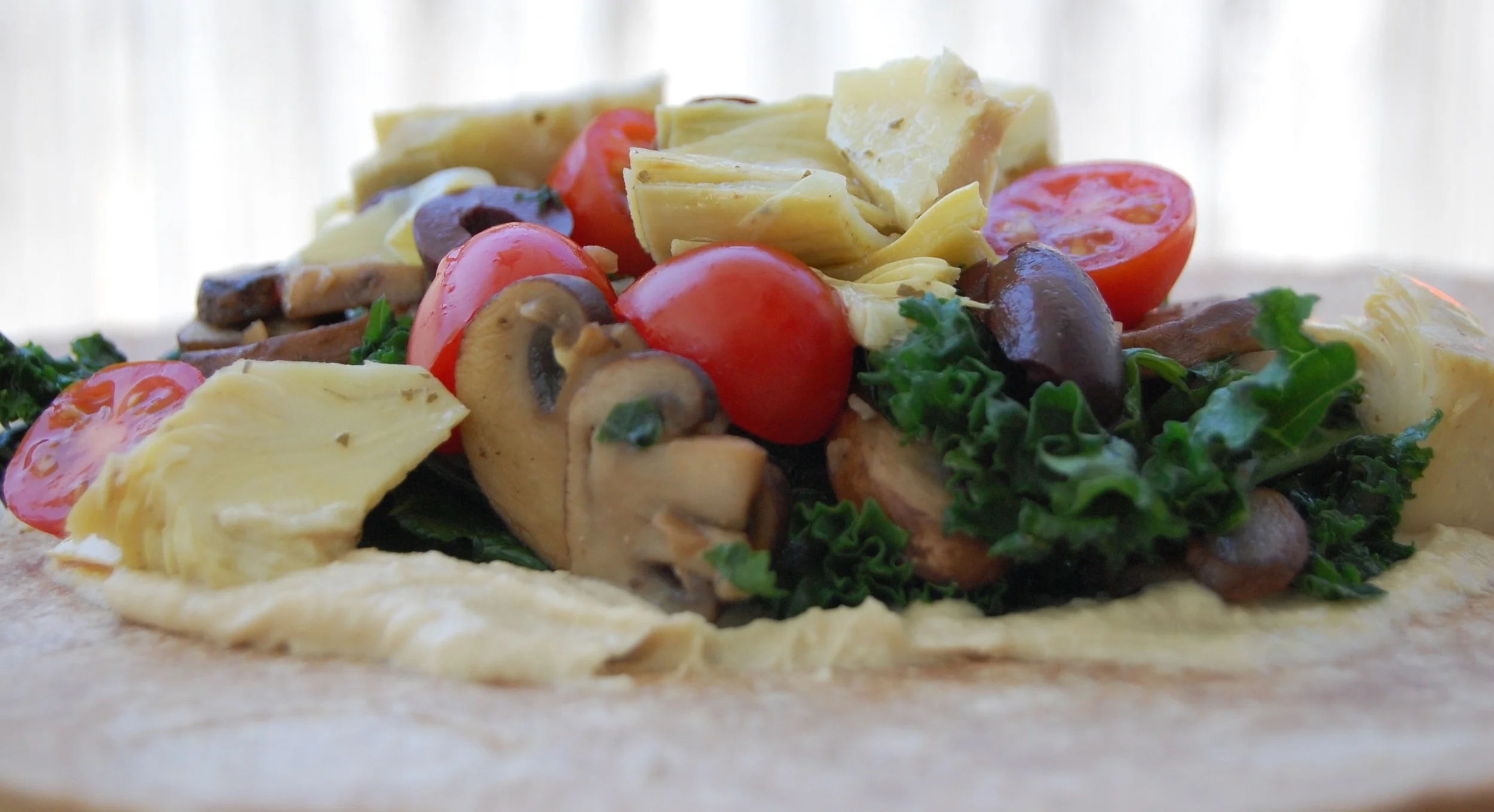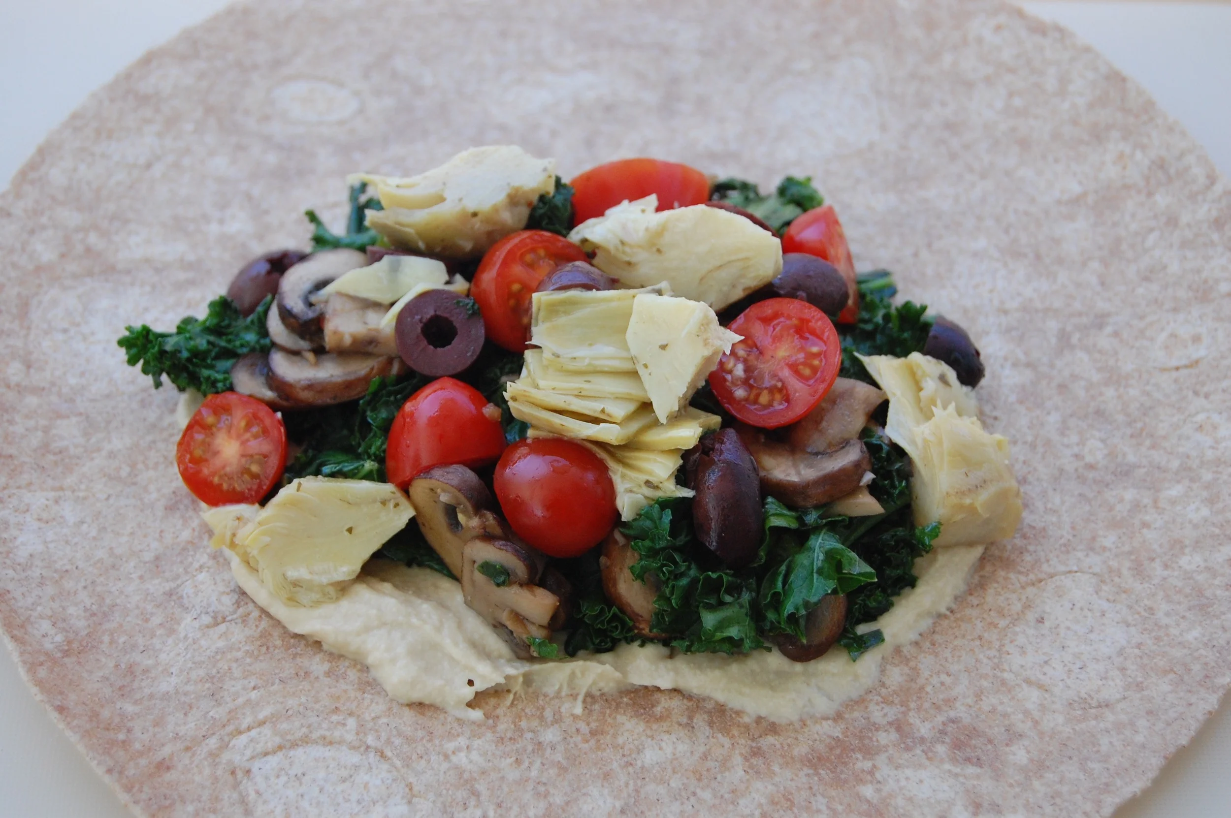 - Top with desired amount of cherry tomatoes, kalamata olives, and artichoke hearts. Roll up by folding the two sides over and then rolling one end up to the other.
